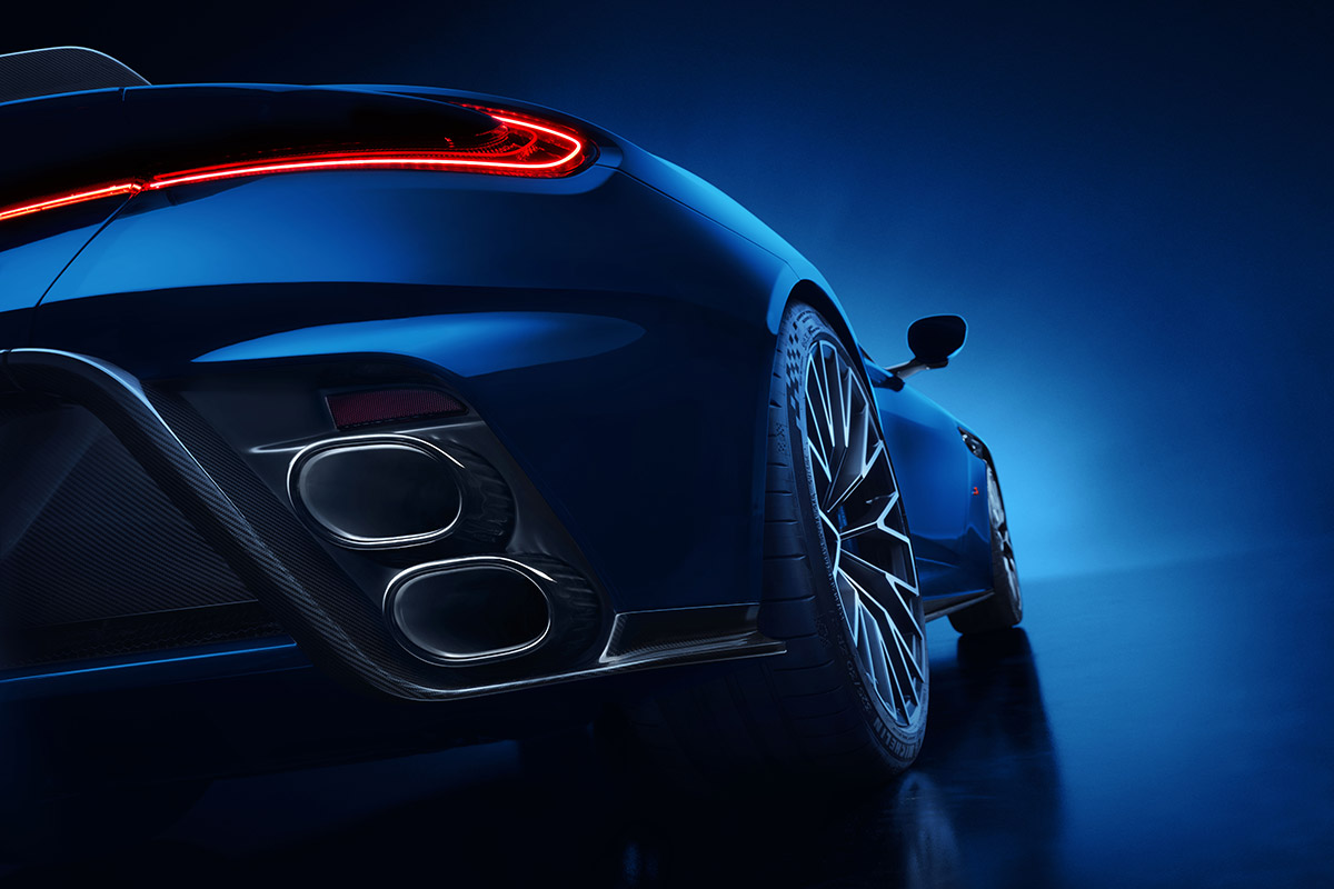 The rear design of the DB12 S makes an emphatic statement, capturing the essence of boosted power, sharpened dynamics and an unforgettable soundtrack. Once again aerodynamics play a major role, the fixed rear spoiler adding drama and increasing high speed stability. Below sits the new rear diffuser, which reduces lift while allowing space for the DB12 S signature stacked pairs of exhaust tailpipes, which are framed within a broader rear bumper for maximum visual impact.