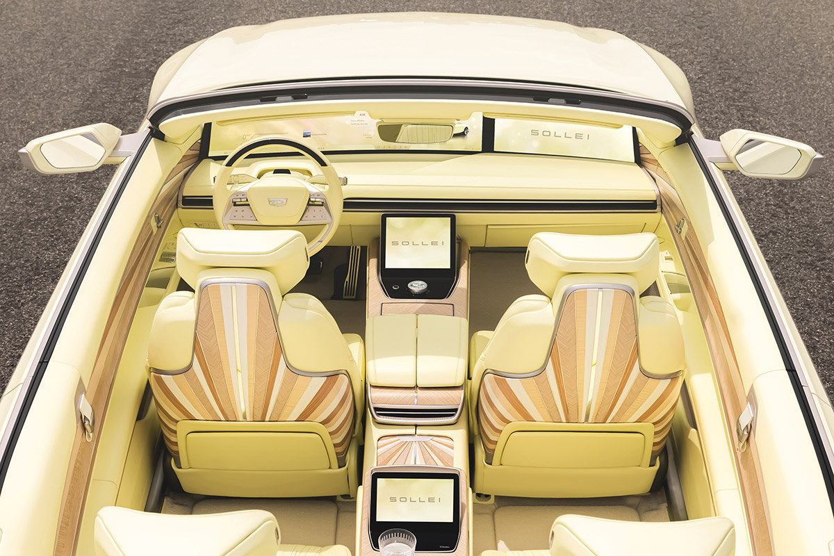 SOLLEI conceptualizes an all-electric, 2+2 convertible equipped with the brand’s signature 55-inch pillar-to-pillar screen, awe-inspiring interior, exterior lighting chorography for arrival and departure, and intuitive front and rear command console.