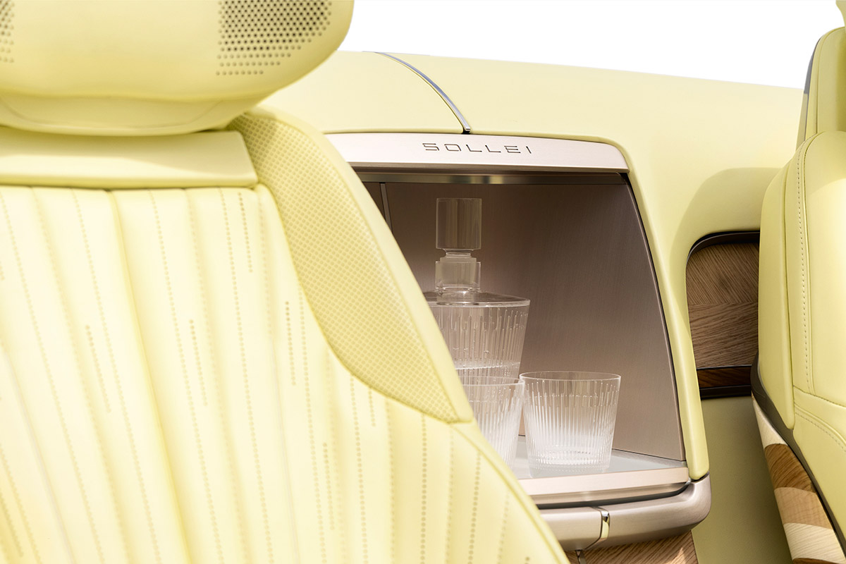 The interior of SOLLEI channels Cadillac’s “art of travel” design philosophy, elevating the travel experience for both driver and passenger. Features include a fully integrated beverage chiller with a power glass door and crystal glasses seamlessly blending leisure with travel.