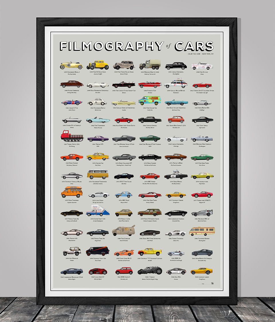 It’s time to take a four-wheeled trip down movie memory lane. The Filmography of Cars print you see here features over 71 intricately detailed hand-illustrations by artist Calm The Ham, charting the iconic cars of film and television from 1929 to the modern day