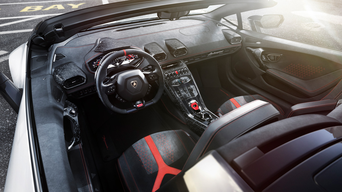 Making it’s debut at the Geneva Motor Show this week, the Huracán Performante Spyder sports much of the same mechanics as it’s coupe sibling, with a 5.2L naturally aspirated V10 that puts out 640-horsepower and 442 lb-ft of torque. That power is routed through a seven-speed automatic transmission and a performance-tuned all-wheel drive system.