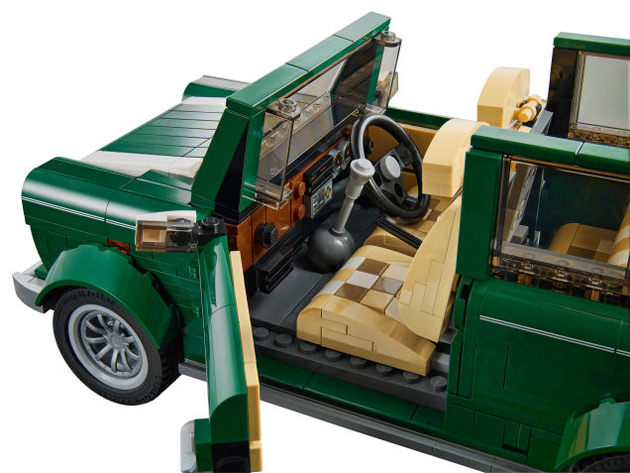 That’s right, the famous and iconic British classic has been given the LEGO treatment! The set measures 4″x9″x5″, and the replica of the Mini Cooper Mk VII comes complete with “classic green and white color scheme with white wing mirrors and racing stripes, to the opening doors, hood and trunk, sporty fog lights, detailed engine and separate spare tire compartment. You can even remove the roof to access a tan colored interior with patterned seats, veneer-style dashboard, turning steering wheel, and moving gearshift and handbrake.”
