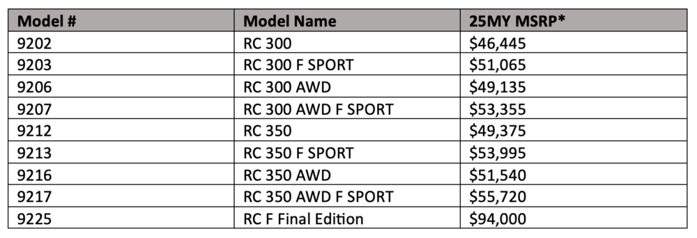 2025 RC and RC F Pricing
