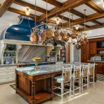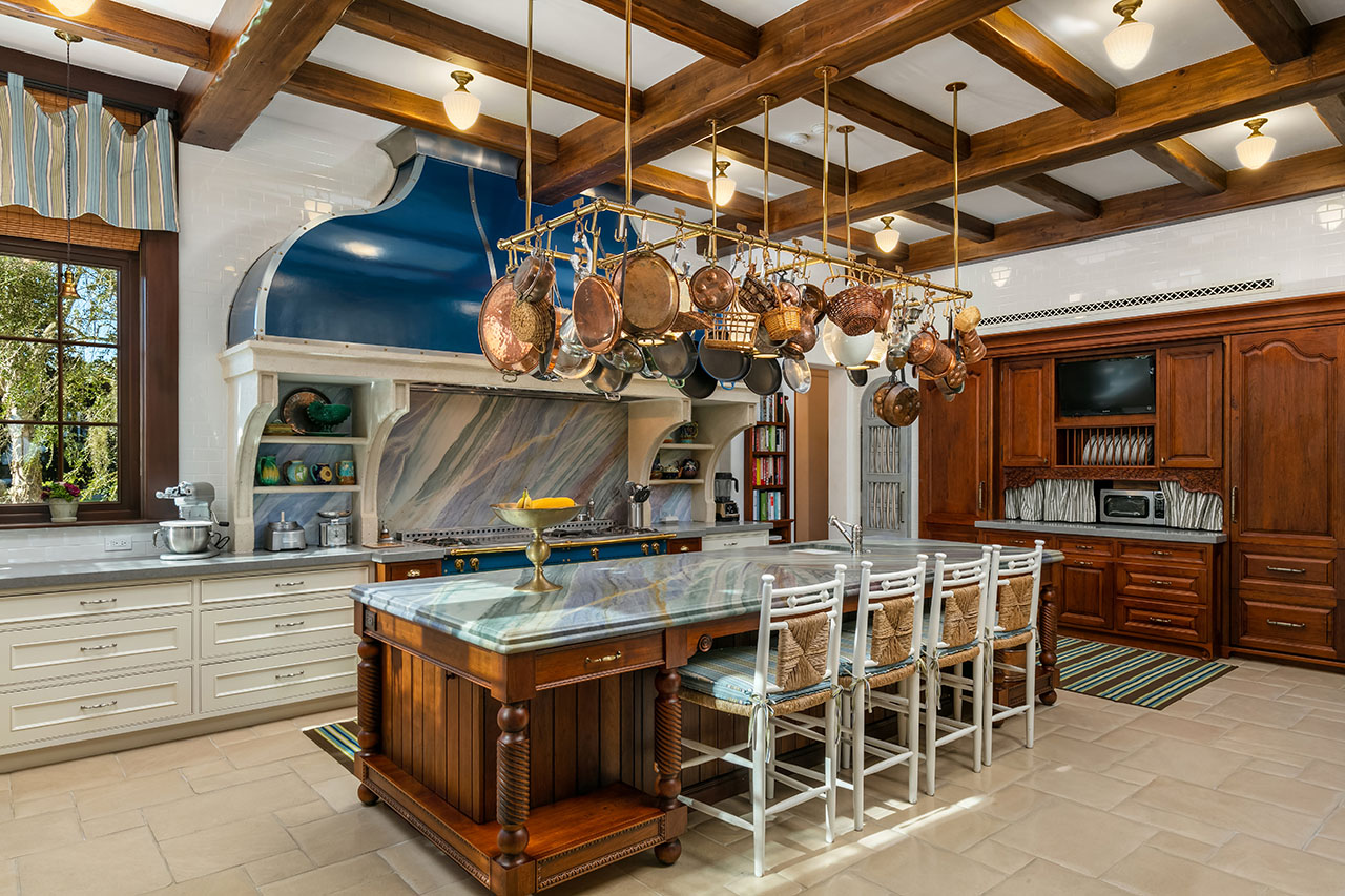 For those who like to cook, they’ll appreciate the huge open layout kitchen that features top-of-the-line appliances from Perlick, Imperial blue granite on the countertops and backsplash, and Subzero refrigerators. An industrial-grade, 72-inch LaCornue range anchors the space.