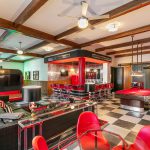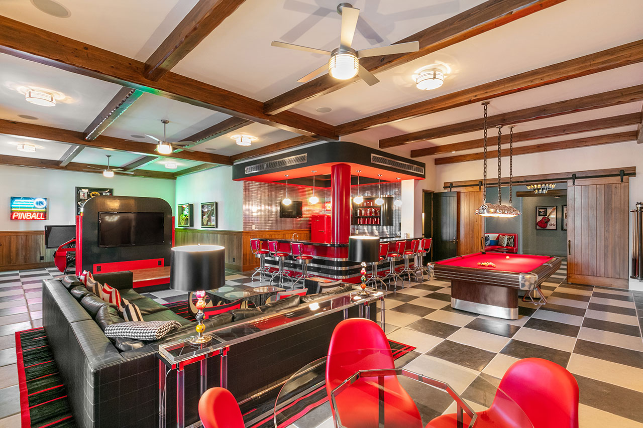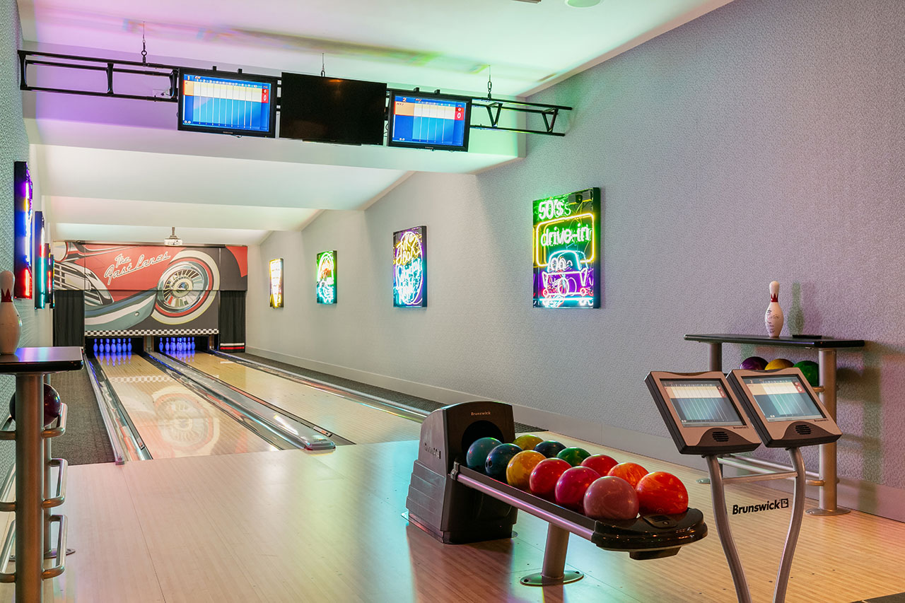 Naturally, no home is complete without a vast ground-floor man cave, complete with bowling alley and 1950s-style diner, dedicated home gym complete with a saltwater pool, steam and sauna rooms, massage area, and even two race-driving simulators. With all of this cool stuff, why would you ever leave here?