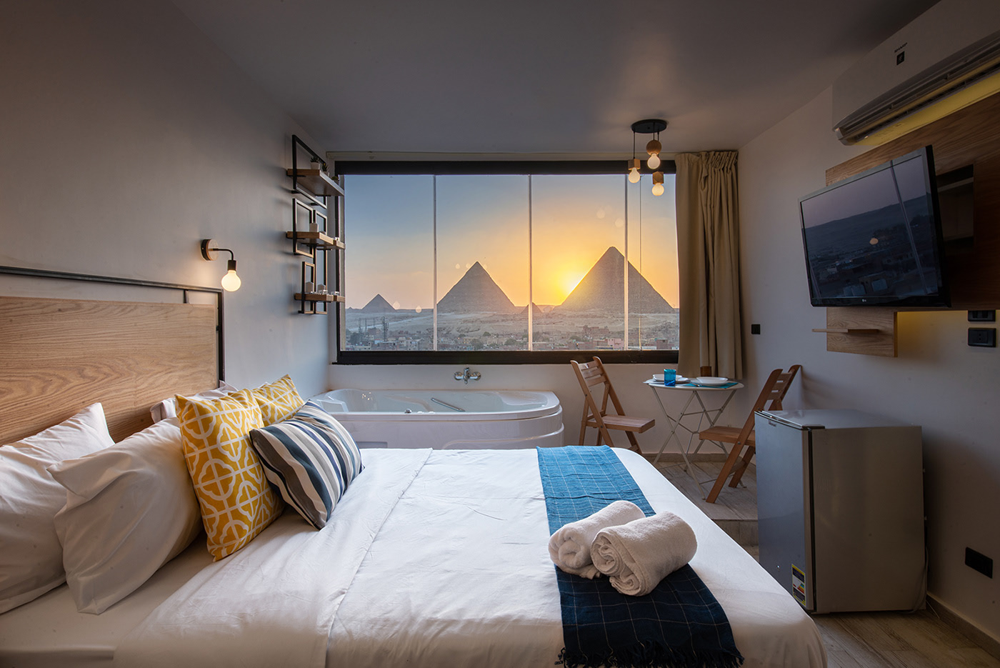 Seriously, just look at these photos! This 1-bedroom apartment is located just a 5-minute walk from the Pyramids entrance gate, and it offers a stunning view of all the Giza Pyramids from anywhere within this contemporary oriental studio or while relaxing in the Jacuzzi available. Yes, you can gaze out at this amazing wonder of the world from your private Jaccuzi!