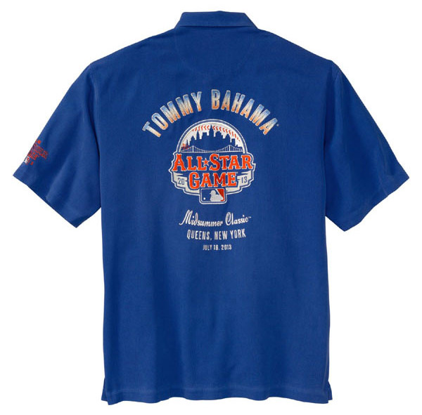 In celebration of America’s pastime, Tommy Bahama has created a limited edition 2013 MLB All-Star Game shirt commemorating the Midsummer Classic at the home of the New York Mets. The royal blue silk camp shirt features the 2013 MLB All-Star Game with an orange and white embroidered logo on the back and sleeve. The shirt retails for $158.