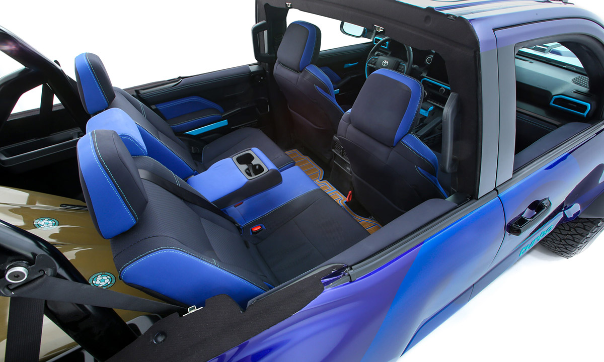 Off-road capability is taken to the next level with a long-travel suspension system, billet aluminum A-arms, designed to handle the toughest terrain while providing a smooth ride. Steering upgrades, custom front axles, and Toyota Tundra rear-end housing complement the custom suspension. At each corner, 37-inch tires, mounted to 17x.8.5-inch custom wheels, complete the concept’s muscular appearance.