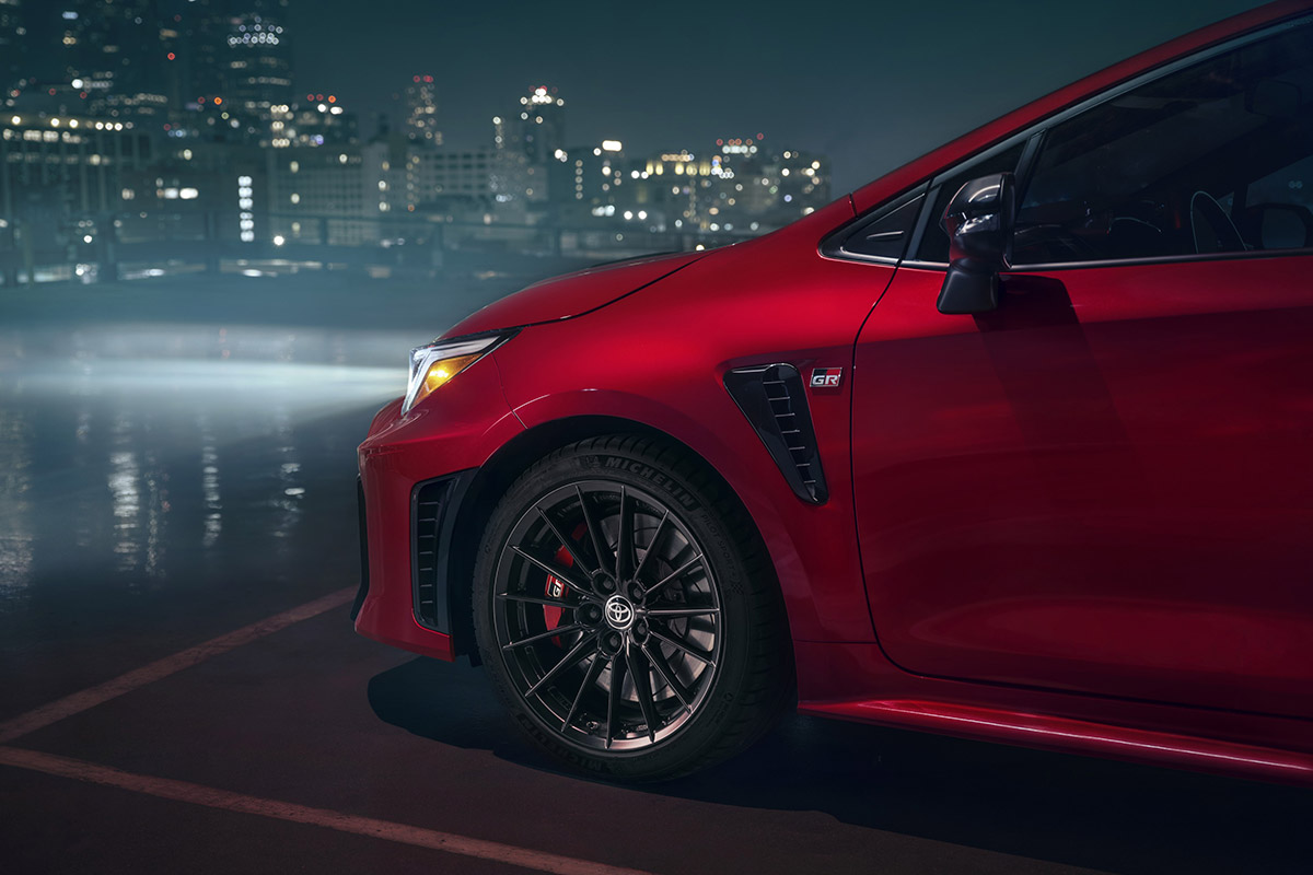 For 2025, the GR Corolla will be available in three grades: Core, Premium and the aggressive, new for MY2025, Premium Plus. Built on the TNGA-C platform, the GR Corolla has a low center of gravity with wide tread tires mounted to cast alloy 18-inch wheels on the Core and Premium grades and 18-inch matte black wheels on the Premium Plus. All GR Corolla models wear Michelin Pilot Sport® 4 tires 235/40R18.