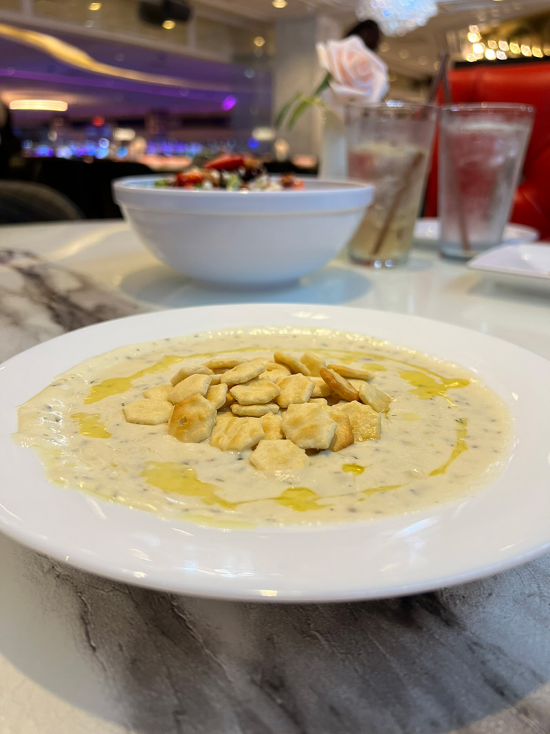 Next up, we ordered some appetizers for the table. I was stoked for the Field Green Salad ($15), which has sliced strawberries, toasted pecans, blue cheese, and is in a sherry vinaigrette. It’s a massive salad, definitely big enough for two to share. While it was good, I was blown away by the New England Seafood Chowder ($13), which had scallops, shrimp, and cod, with oyster crackers on top. Absolutely DE-LICIOUS!