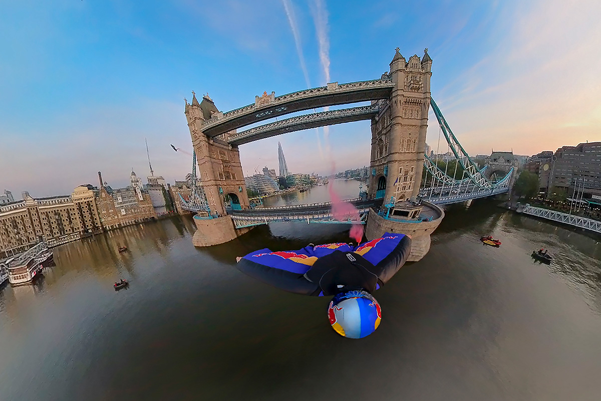 Jumping from a helicopter, the pair descended from an altitude of 3,000ft and flew across the River Thames about 100 feet above the water between the bridge towers. They reached speeds in excess of 153mph as they passed through the narrow ‘window’ between the iconic towers.