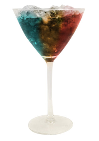 Preparation: Mound fine crushed ice in a cocktail glass using a large ice cream scoop. Pour each ingredient, one by one, in stripes to create a horizontal layering of the ingredients over the crushed ice. Serve with a demitasse spoon.