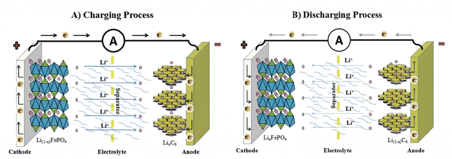 For all the science geeks out there, its anode material is LiaC6, and the cathode material is LibFePO4, with the carrier being Li+.